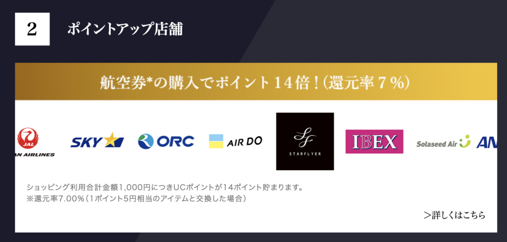 日系の航空会社の航空券をUCプラチナで購入すると、ポイント還元率が常時7%(通常1%+ボーナス6%)になります。